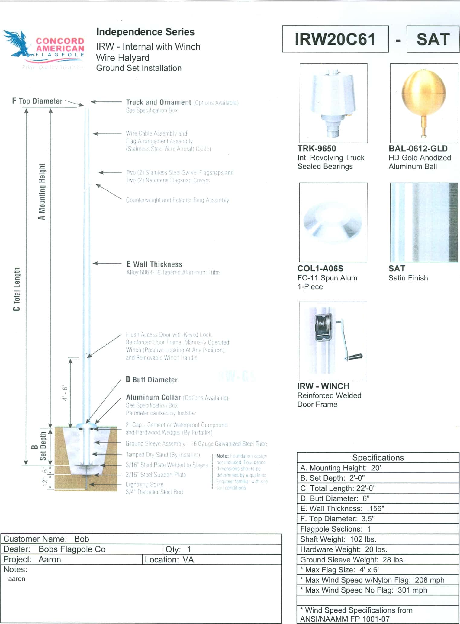 Concord America's top flagpole series. This flagpole installs with ease requiring about 2 hours to complete the site preparation. The preparation requires about 3 sacks of concrete, a shovel and a level. Your flagpole can be put in place in as little as 24 hours from the time your site preparation is completed. Complete easy to follow instructions are included. Designed for a lifetime of enjoyment. Windspeed tolerance unflagged 208 MPH. Many different colors are available. Flagpoles are available up to 100'. Nautical poles with yardarm are also available from 25' to 80' Different mounting bases, shoe base, hinged shoe bases are available as options.