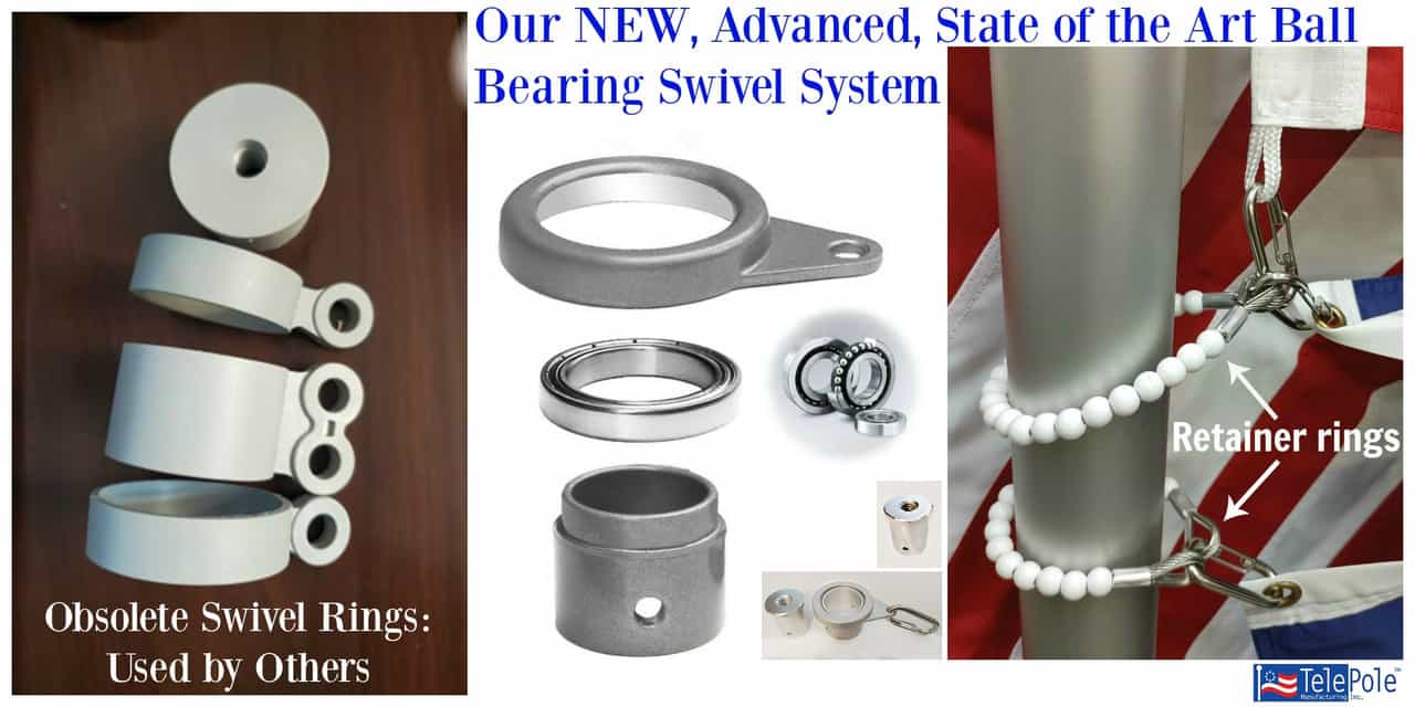No more plastic, lexan, polycarbonate, nylon material, etc swivel rings that eventually deteriorate and discolor under adverse weather conditions. A pressed stainless steel sealed ball bearing embedded into a custom made aluminum casing exclusively for Telepole flagpoles only.